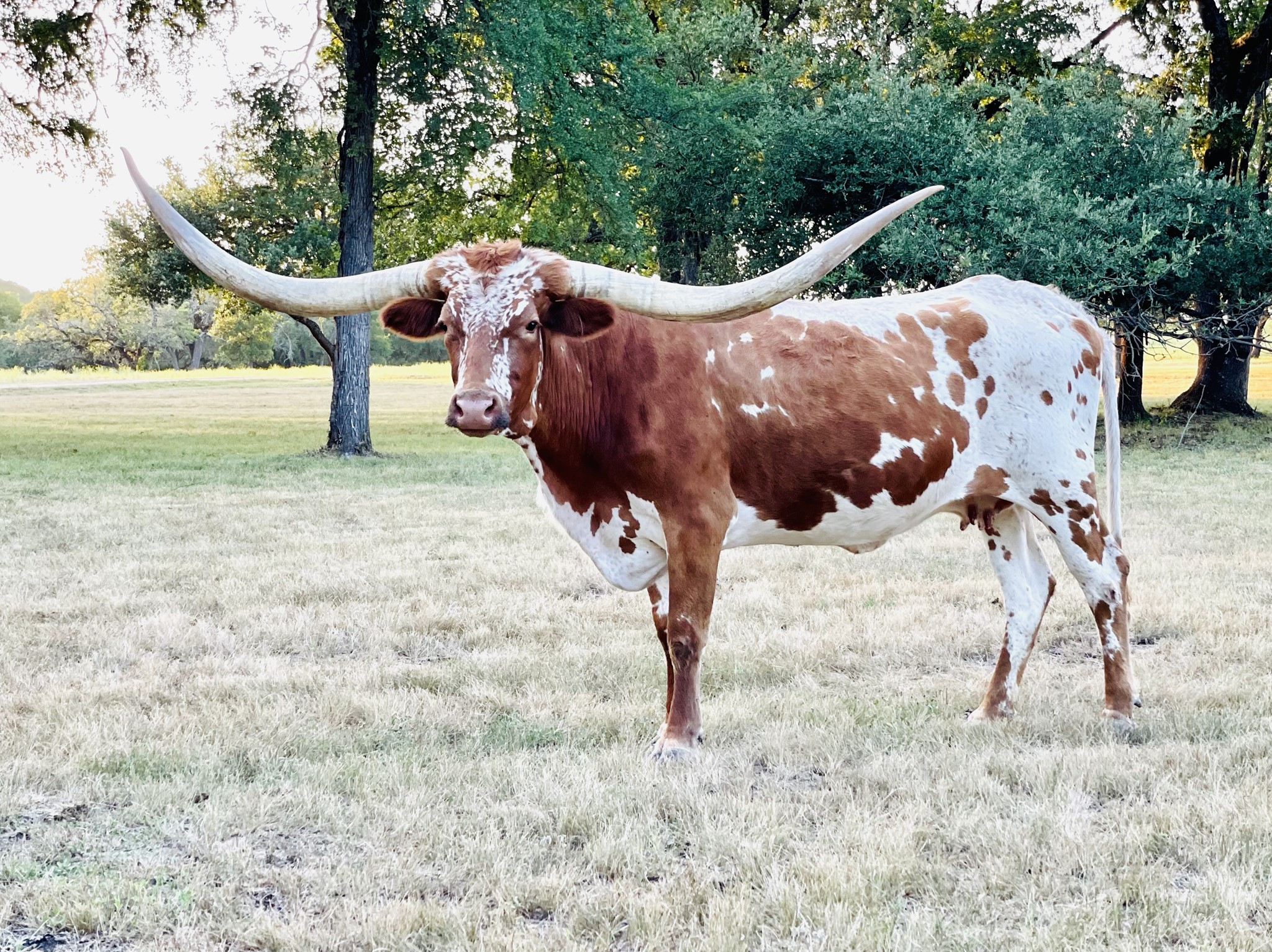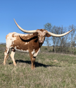Such a sweet cow. We love her color and frosty face along with her big lazy rolling horns. She currently has a stunning Delta Lucky Ace heifer by side and is exposed back to our black and white herd sire TIED OFF.