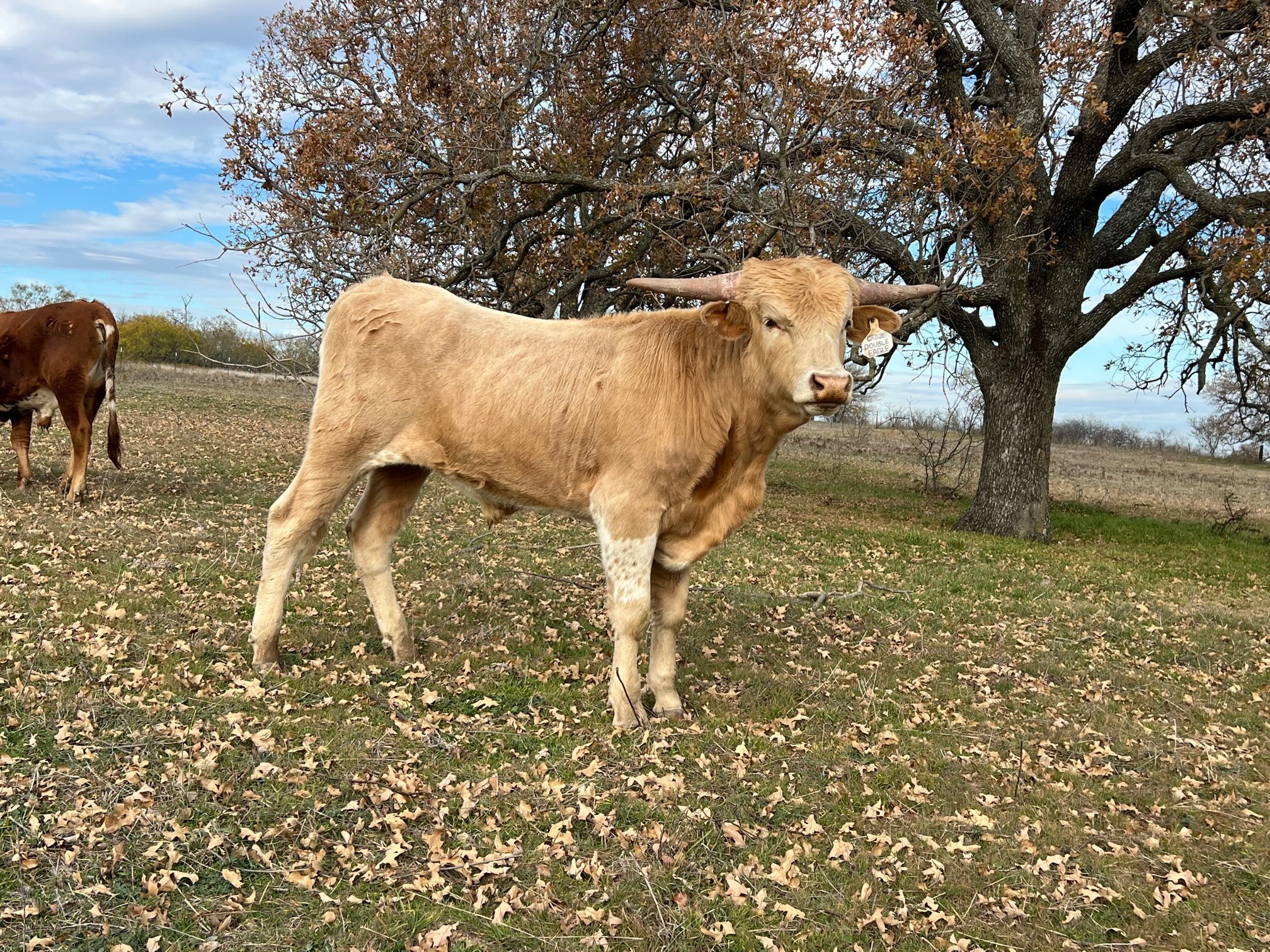 The color on this guy is outstanding and how can it not be with his sire being PCC Grey Eagle? Horns have a rollback to them so we have been excited to see what they are going to do! Strong body structure with a masculine face will be a great bull to add to your herd.