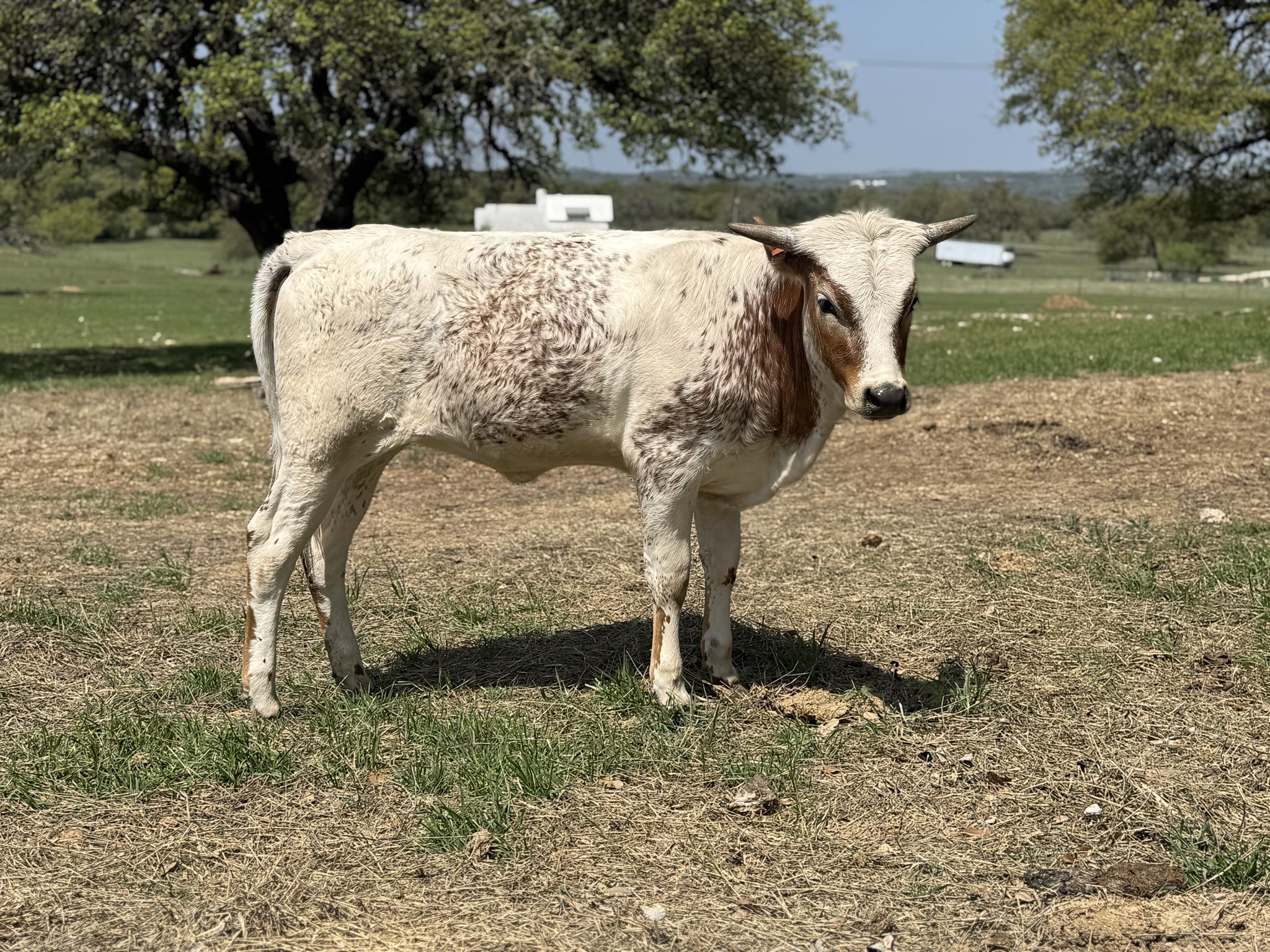 Her dam, Casanovas Candy, is a big-bodied daughter of the 95"+ Casanovas Magnum, known for consistently producing colorful offspring. Her sire, the 87"+ TTT Hubbels 20 Gauge, is a two-time Bull of the Year (2022-2023) with over $72,000 in lifetime earnings. His progeny demonstrate early horn growth, beautiful coloring, and complete package qualities that have established him as one of the breed's most influential sires.